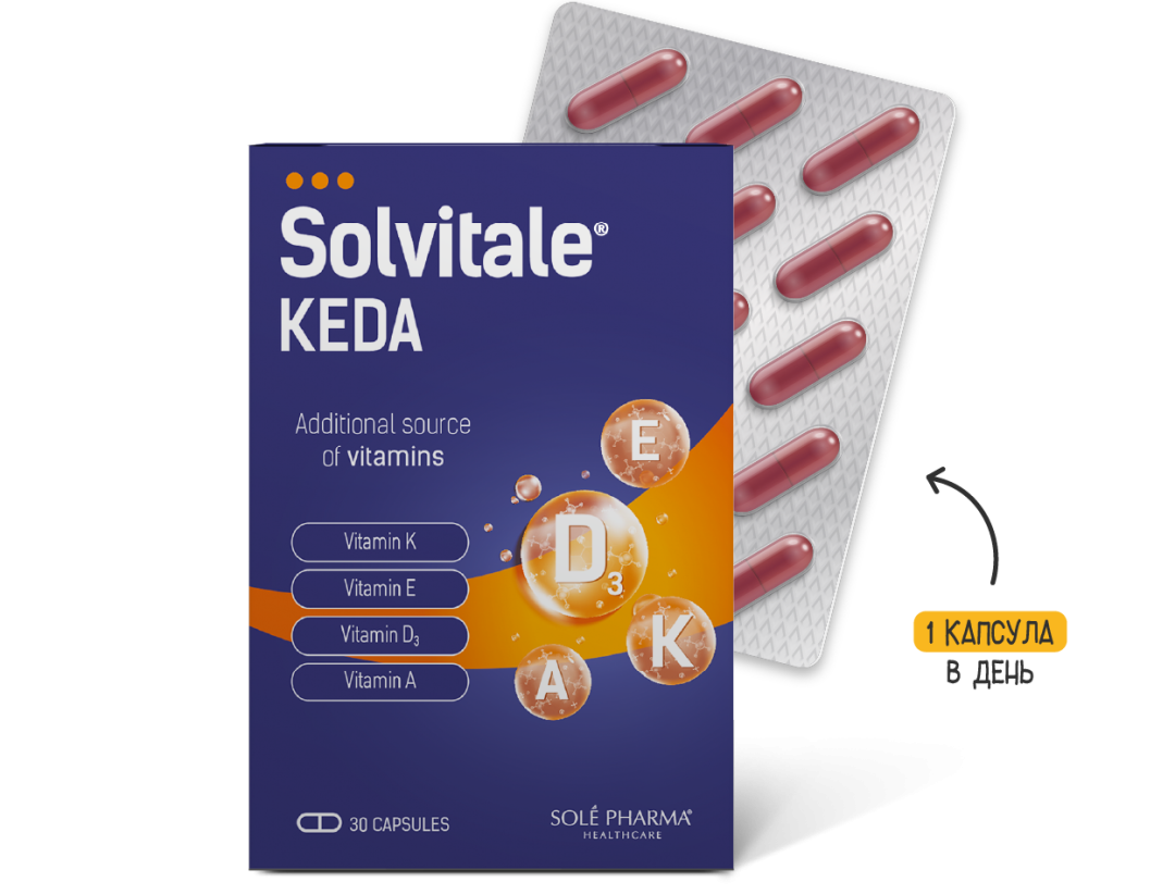 Solvitalе® KEDA предлагает 2 лучших сочетания – витамины D3 и K2, витамины E и A.
